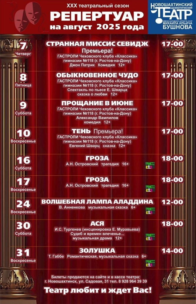 Новошахтинский драматический театр им. М. Бушнова опубликовал афишу на август