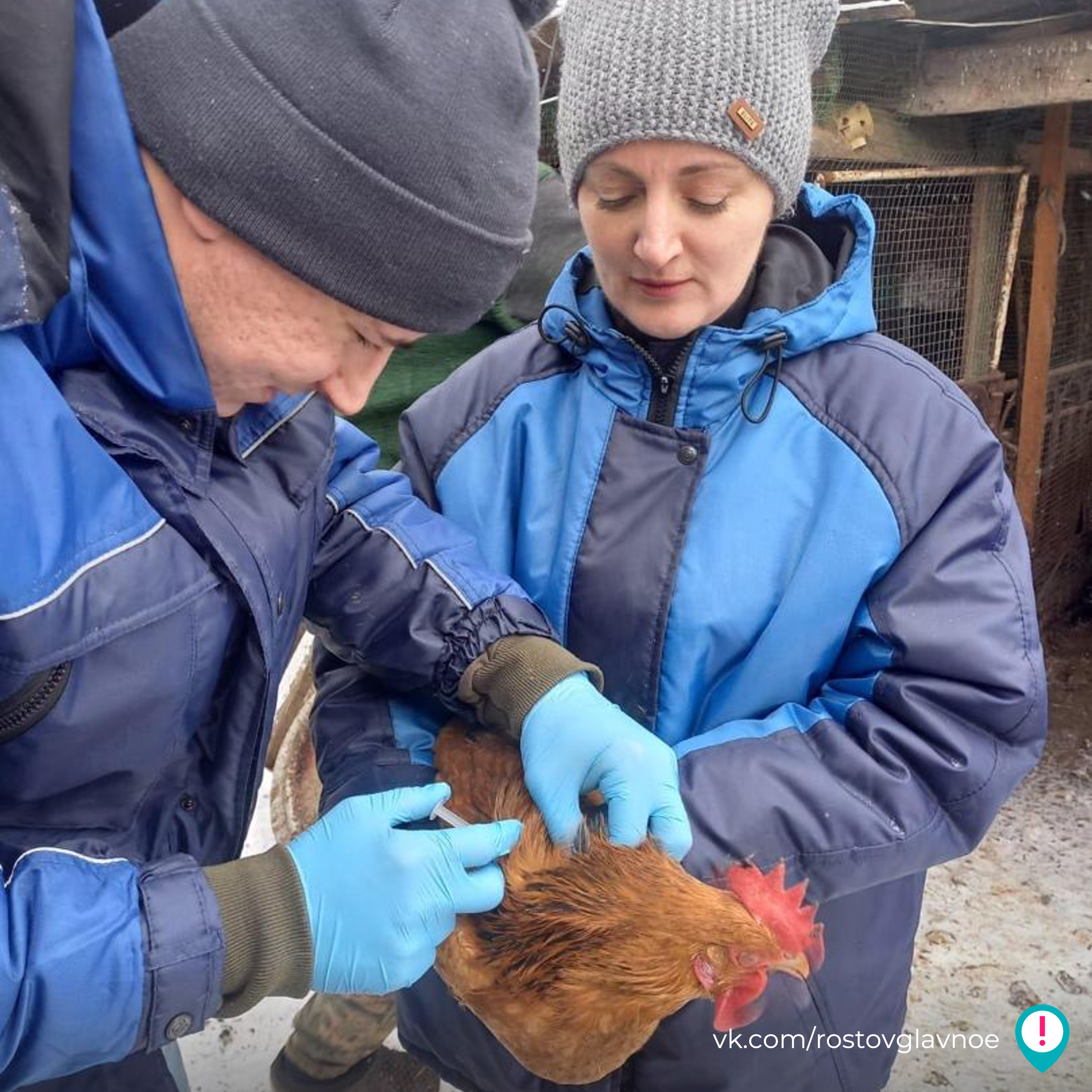 Заведующий ветеринарной лечебницей Сальска Виктория Цветашева и ветеринарный врач Андрей Разумовский проводят вакцинацию птицы против гриппа в Сальске.