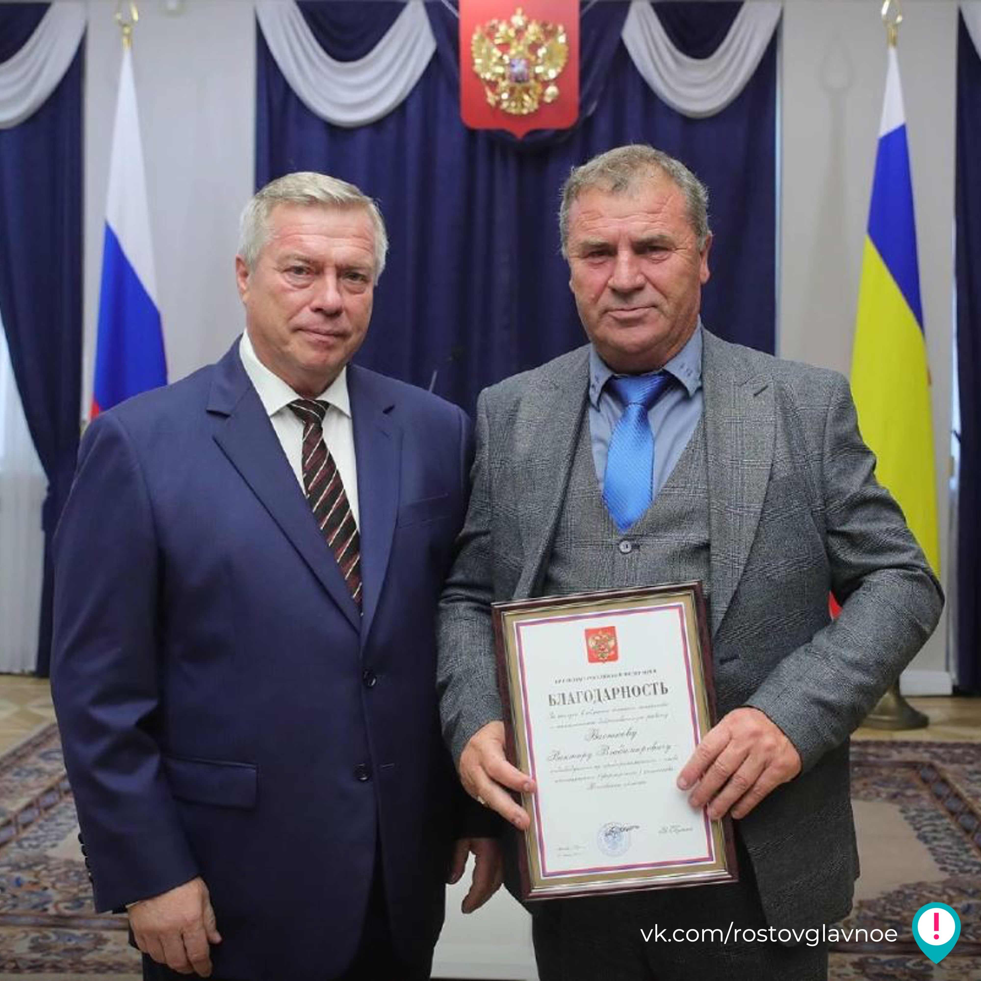 Виктору Васюкову, индивидуальному предпринимателю - главе крестьянского хозяйства, от имени Президента Российской Федерации губернатор Ростовской области Василий Голубев вручил Благодарность за заслуги в области сельского хозяйства и многолетнюю добросовестную работу.